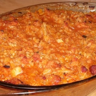 Directii: Varza murata se scurge de apa (folositi un tifon sau in pumn). Daca varza a fost murata intreaga se taie fideluta foarte, foarte subtire. Se incing intr-o tigaie adanca 5 linguri de ulei si apoi se adauga varza murata si 1/2 lingurita piper, mararul, 1/2 lingurita cimbru. Se caleste la foc mic pentru 15 minute, amestecand din cand in cand. Intr-o oala se pune multa apa, plus sare si cand fierbe se adauga orezul. Se lasa sa fiarba 5 minute, se stinge focul si se lasa orezul in apa pana e nevoie de el. In alta tigaie se incing 2 linguri de ulei si se caleste in el ceapa tocata marunt. Cand se inmoaie, se adauga carnea tocata si se prajeste pana isi schimba culoarea. Se stinge focul si se adauga usturoiul strivit, boiaua, 1/2 lingurita cimbru, 1/2 lingurita piper si putina sare (varza e sarata destul de mult, a nu se exagera cu sarea). Se amesteca bine si se lasa deoparte. In blender sau cu masina de tocat carne se macina impreuna carnatul afumat si baconul * toate operatiile de mai sus se fac in paralel pentru a economisi timp Cand sunt pregatite toate ingredientele de mai sus, se scurge orezul si se adauga putina sare in el. Se unge un vas termorezisten cu untura (sau ulei) si se pune si o lingura de untura pe fund. Se creeaza straturile in vas in urmatoarea ordine: - o treime din varza murata - jumatate din carnea tocata - jumatate din orez - 4 linguri smantana pe care o nivelam cu dosul lingurii -jumatate din amestecul de carnat+bacon si se reia: - iar o treime de varza - restul de carne tocata - restul de orez - 4 linguri smantana pe care o nivelam cu dosul lingurii - restul din amestecul de carnat+bacon - ultimul strat e restul de varza Peste toate acestea se toarna ce a mai ramas din smantana, dizolvata in prealabil cu 1/2 cana apa (sau suc de rosii, pentru cine doreste). Se da la cuptor la 180C pentru 1 ora. Daca se foloseste vas din ceramica, e de preferat cuptorul neincalzit pentru a preveni craparea lui din cauza socului termic si se lasa cu 15 minute in plus.